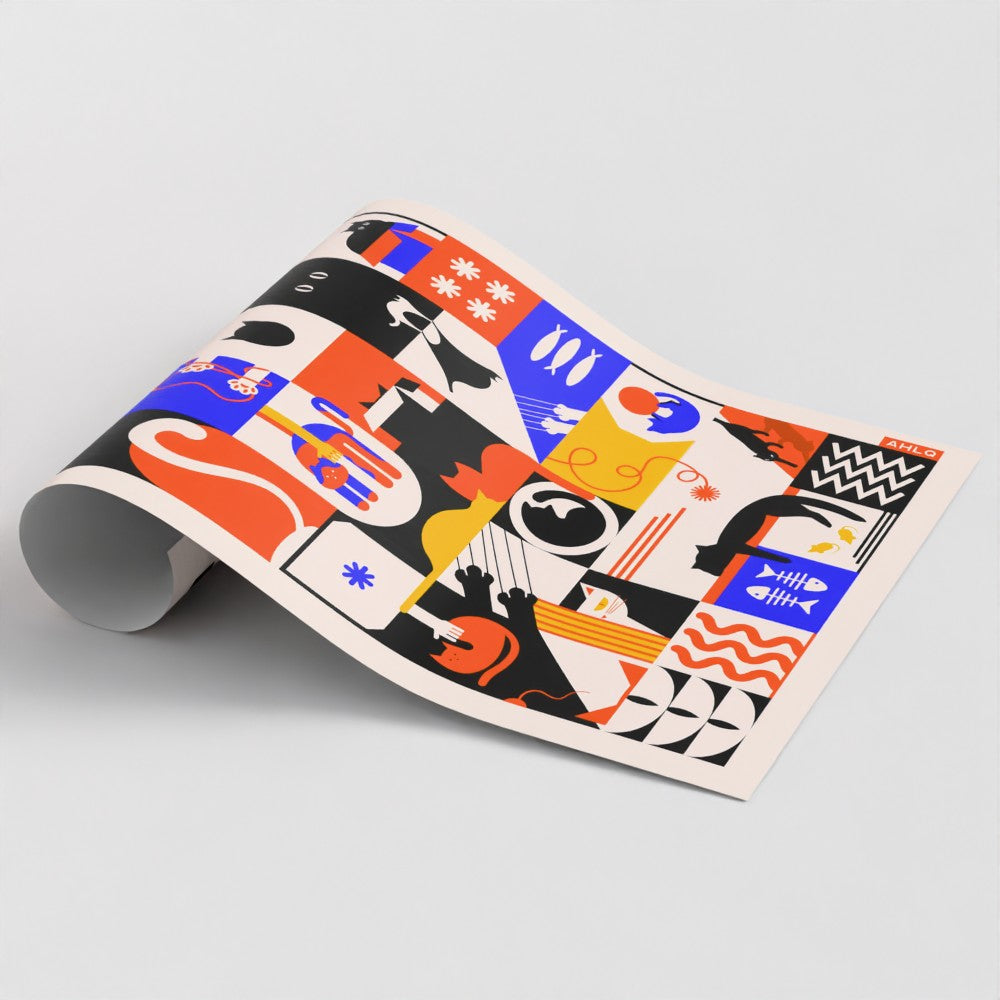 Celebrate the charm of our feline friends with this quirky, cat-filled art print – perfect for cosy nooks, cat lovers, and homes that appreciate a bit of mischief. From playful paws and twitchy whiskers to fishbones and cosy snoozes